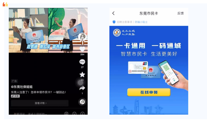 没想到这么方便,刷抖音就能把事情办了!去年毕业开始交社保,但是一直没空去办社保卡,没想到我在抖音上竟然刷到了社保卡的宣传视频。”东莞的潘先生表示从未关注过东莞社保的账号,竟然刷到了它的视频,而且正是自己想要办的业务,这让他非常惊喜。“视频很有趣,让人很快就能明白要点,下方还有申请入口链接,我直接填写资料办理,三天左右就收到快递送卡,效率非常高。”
