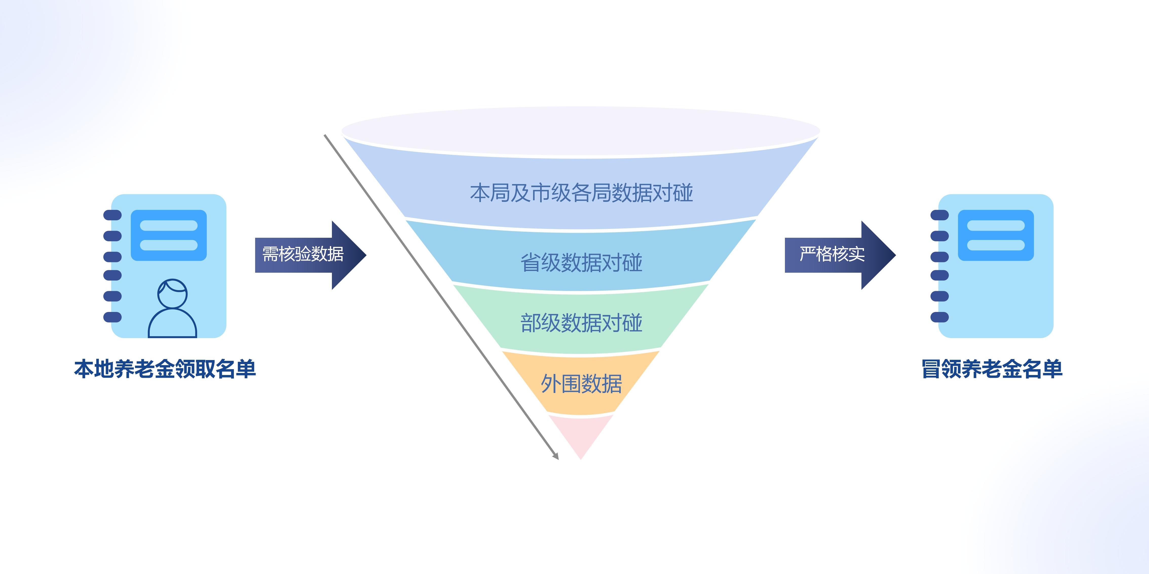 通过对领取社保待遇人员信息、领取待遇资格认证信息、死亡人员信息、政法服刑人员信息等政务数据,以及通信运营商等社会数据信息共享与数据比对,自动识别、提示、预警出死亡冒领、或正在服刑等不具备领取养老金资格的人员名单进行剔除,助力社保基金安全风险防控从“人防”到“技防”的升级,严防养老保险金跑冒滴漏 。