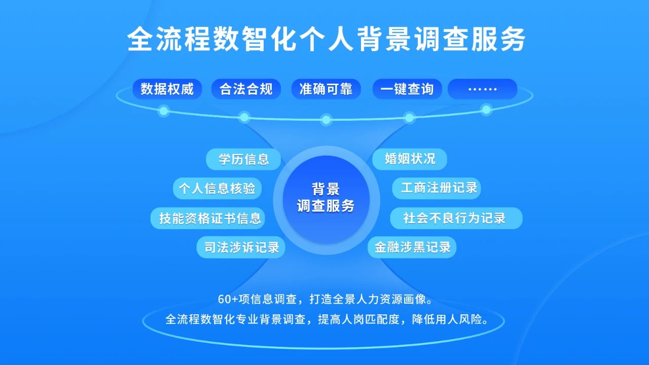 “TapTap职业背调”是基于民生数据应用开发的一款数据产品,通过8大维度资信,科学建模分析,打造全景人力资源画像,涵盖60+项信息调查服务,实现全流程数智化专业背景调查,为用人单位提高人岗匹配度、降低用人风险,是人力资源服务的数字化实践。