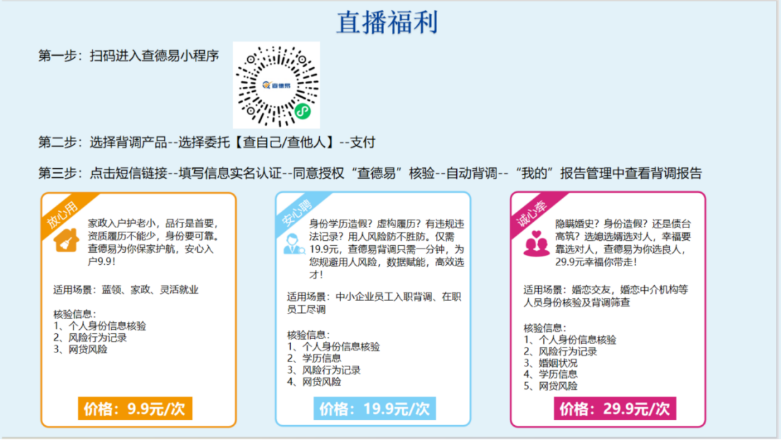 企业招聘领域,直击简历造假、职业道德风险等痛点,推出“19块9安心聘”助力企业高效选才,有效规避用人风险;