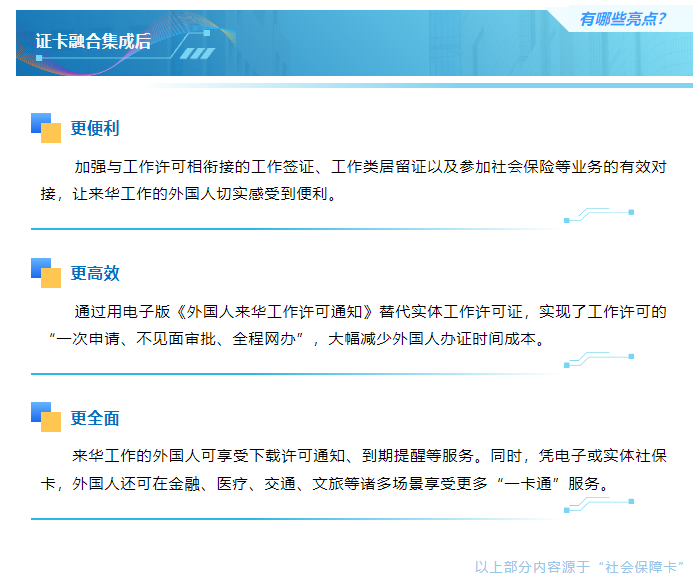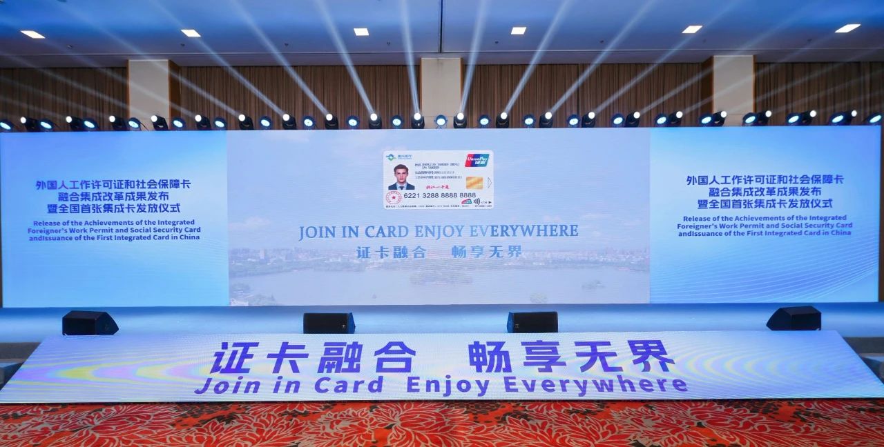全国首张集成卡称为“聚英卡”(Join in Card),寓意着聚天下英才。通过证卡融合集成,将外国人来华工作许可信息加载到社会保障卡,使来华工作的外国人可享受社保卡“一卡通”服务。