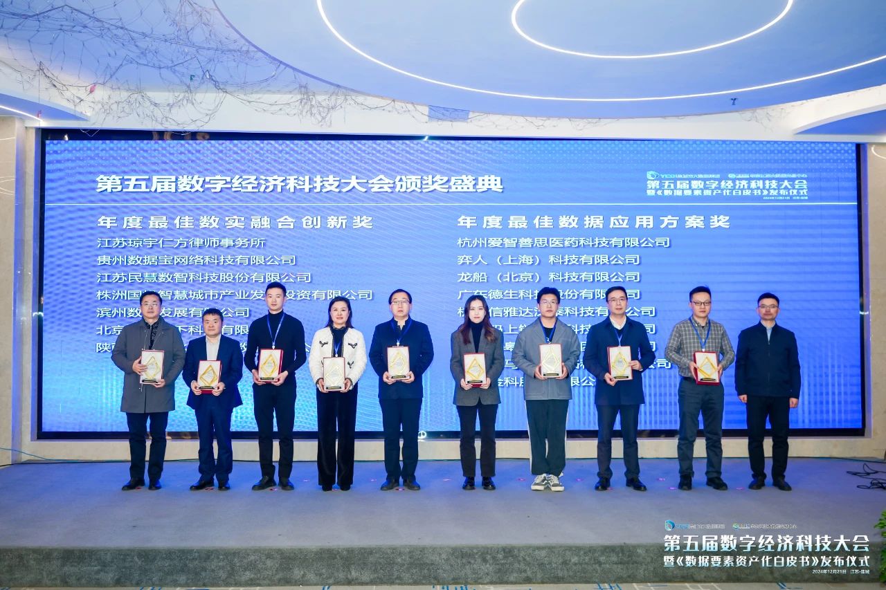 ▲会上,盐城市大数据集团党委委员、副总经理孙建华,华东数交总经理汤寒林与江苏省大数据产业知识产权联盟秘书长吕红秀共同为获奖企业及个人颁发第五届数字经济科技大会奖项。