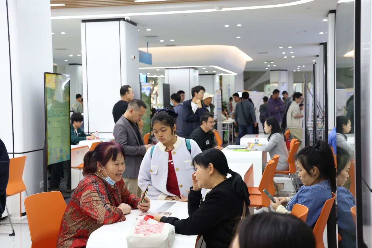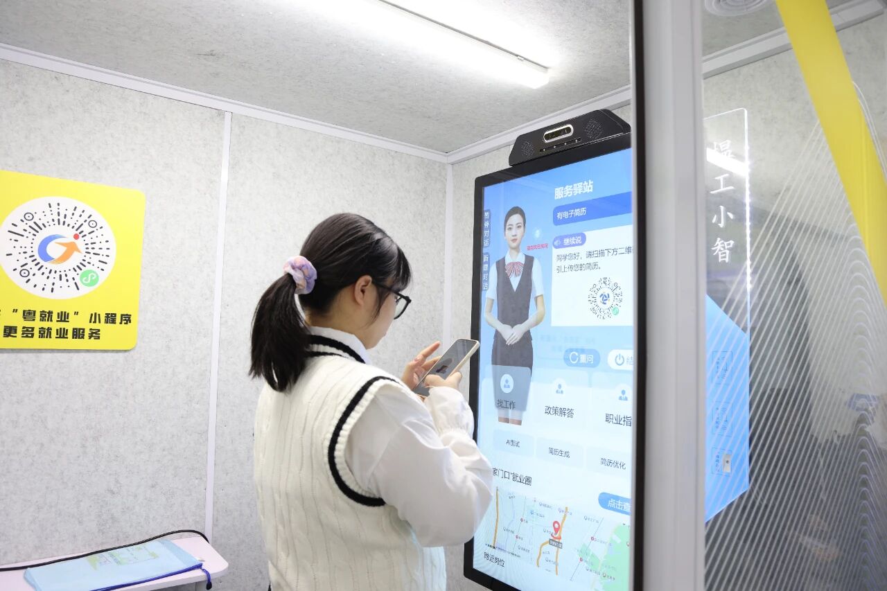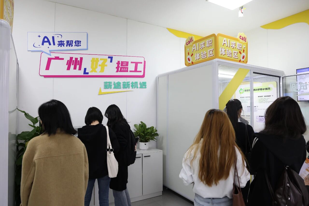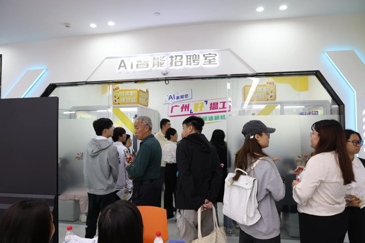 ▲在隔音舱外,求职者正有序排队等候体验“揾工小智”;现场还设置AI求职招聘游园活动区,以互动形式介绍AI服务功能