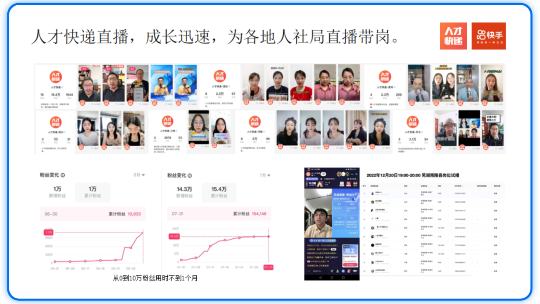 截至2022年底,“人才快递”直播招聘业务已联合1000+服务机构、覆盖全国25个省,在快手平台拥有粉丝数达35万人,获得简历投递总量超2万5千份,现已成为快手官方独家区域代理。