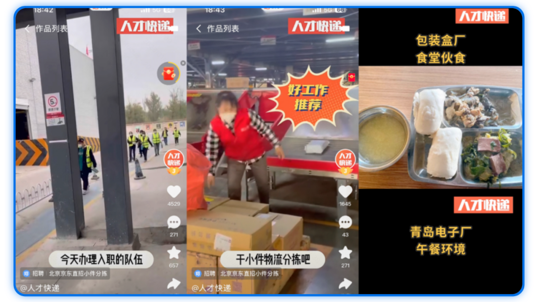 “人才快递”在快手拥有人才快递(主账号18.5万)、人才快递-东北(3万)等矩阵账号。2022年下半年,人才快递通过快招工,持续为多省市的人社局通过直播带岗深入到乡镇田间地头的居民手中,为物流、电子制造、商业服务、邮政、交通运输、公共管理等上百家企业、近千份岗位提供了充足的人力资源。