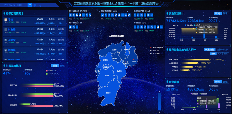 作为公司深度服务的项目——江西省惠民惠农财政补贴资金社保卡“一卡通”发放监管服务系统目前已在鹰潭市、九江市、萍乡市、南昌市、上饶市等30个县区上线服务,全省累计发放71.78亿元,1164.15万人次,惠及188.02万人群,累计有457个补贴项目纳入系统发放,其中有600多个单位实现薪酬福利奖金发放。